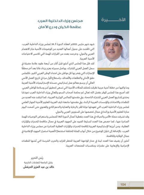 وقـد تشـرفت مجلـة «الأمـن والحيـاة» في هـذا العـدد بتغطيـة أعمـال الـدورة الـ 38للمجلـس واسـتعراض التوصيـات المهمـة