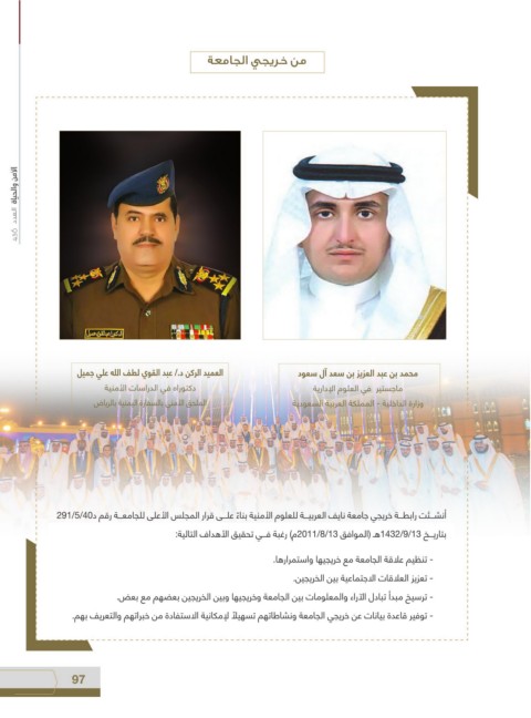 أنشـــئت رابطـــة خريجي جامعة نايف العربيـــة للعلوم الأمنية بنا ًء علـــى قرار المجلس الأعلى للجامعـــة رقم د291/5/40