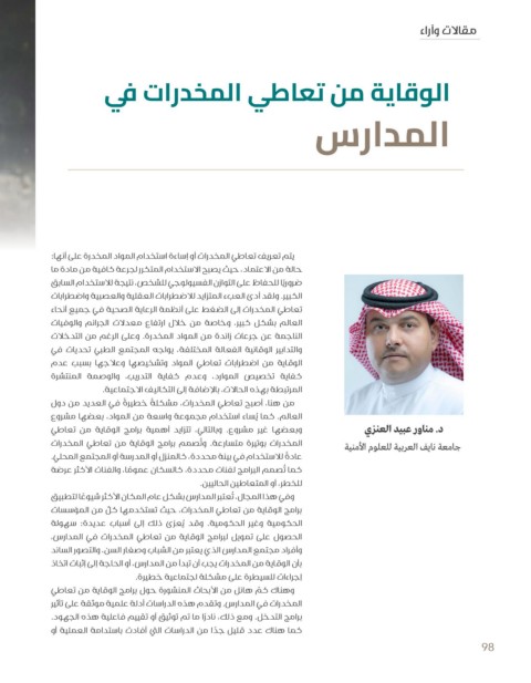 يتم تعريف تعاطي المخدرات أو إساءة استخدام المواد المخدرة على أنها: د .مناور عبيد العنزي